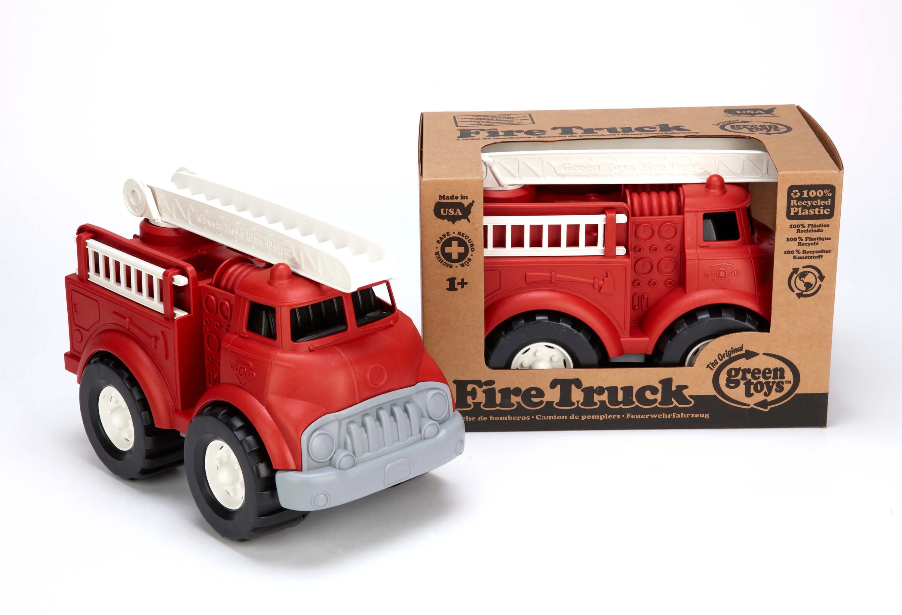 Put out 3-alarm blazes. Rescue kittens from treetops. Protect the environment from harm. This is just a typical day in the life of The Green Toys Fire Truck, the worlds greenest emergency vehicle. Solidly constructed from 100% recycled plastic milk containers that save energy and reduce greenhouse gas emissions, the Green Toys Fire Truck has no metal axles, so it's safe for both the earth and the Good Green Fun seekers who call it home. Sturdy roof ladder pivots vertically and rotates 360 degrees. Two removable side ladders. No BPA, PVC, or phthalates. Packaged using only recycled and recyclable materials