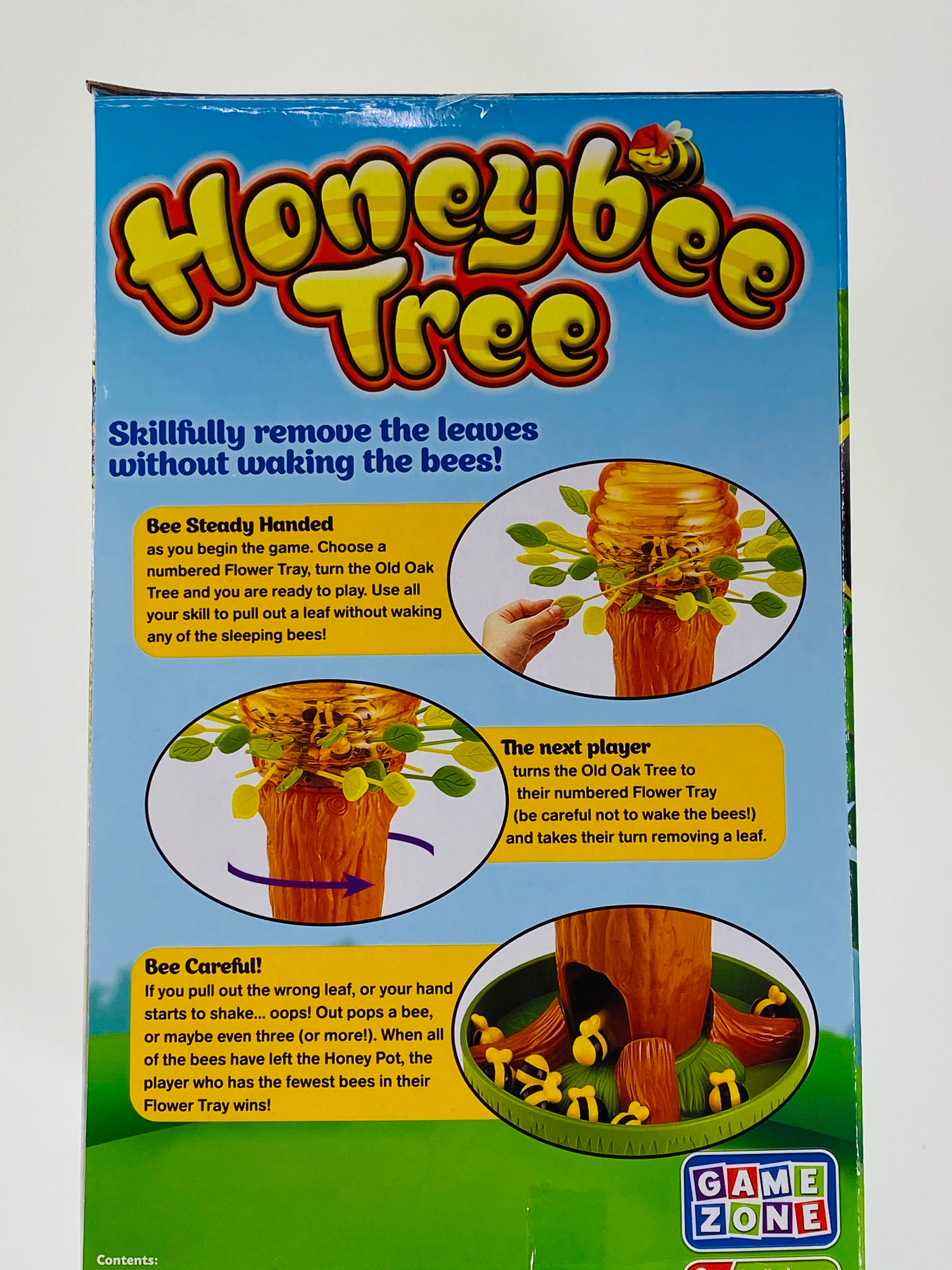 Bee steady handed as you begin the game, choose a a numbered flower tray, turn the old oak tree and you are ready to play. Use all your skill to pull out a leaf without waking any of the sleeping bees.